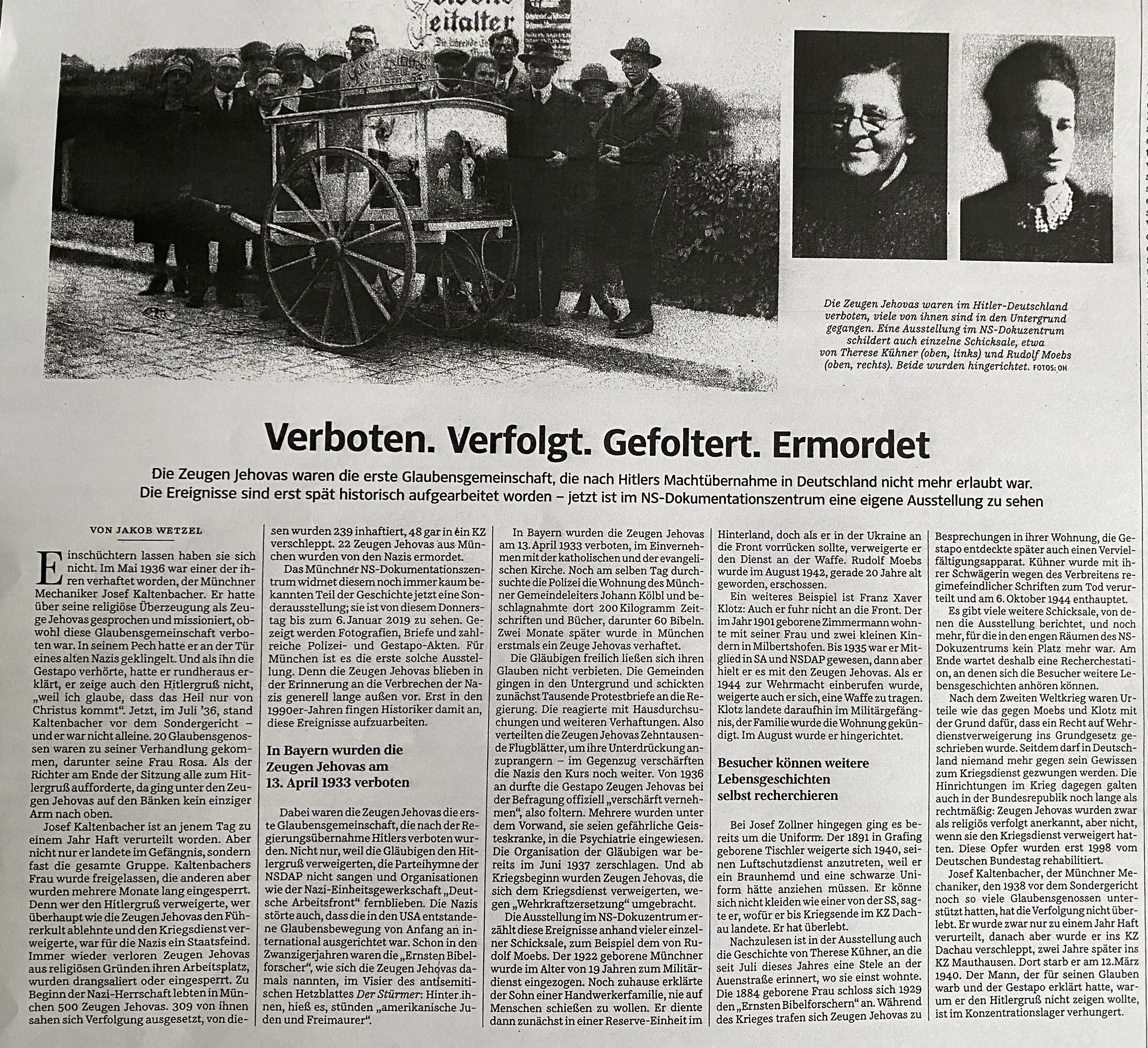 “Das Münchner NS‐Dokumentationszentrum widmet diesem noch immer kaum bekannten Teil der Geschichte … eine Sonderausstellung. … Denn die Zeugen Jehovas blieben in der Erinnerung an die Verbrechen der Nazis generell lange außen vor. … Die Gläubigen freilich ließen sich ihren Glauben nicht verbieten. Die Gemeinden gingen in den Untergrund und schickten zunächst Tausende Protestbriefe an die Regierung … Und ab Kriegsbeginn wurden Zeugen Jehovas, die sich dem Kriegsdienst verweigerten, … umgebracht. Die Ausstellung … erzählt diese Ereignisse anhand vieler einzelner Schicksale …”